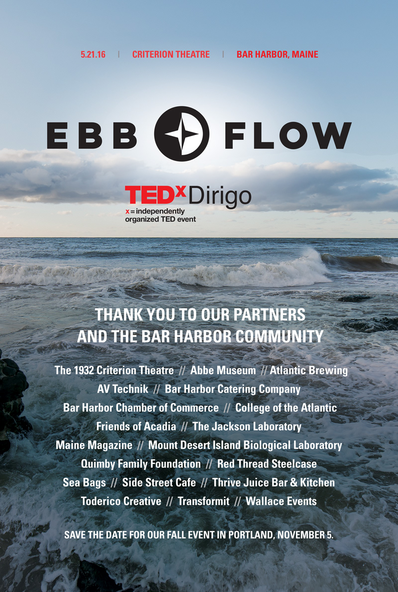 Celebrating Acadia National Park and the National Park System’s 100th anniversary, TEDxDirigo Ebb + Flow explored how human communities have shaped the form and history of the Mount Desert Island and vice versa. This was our first theme where all the talks were focused on a specific region.